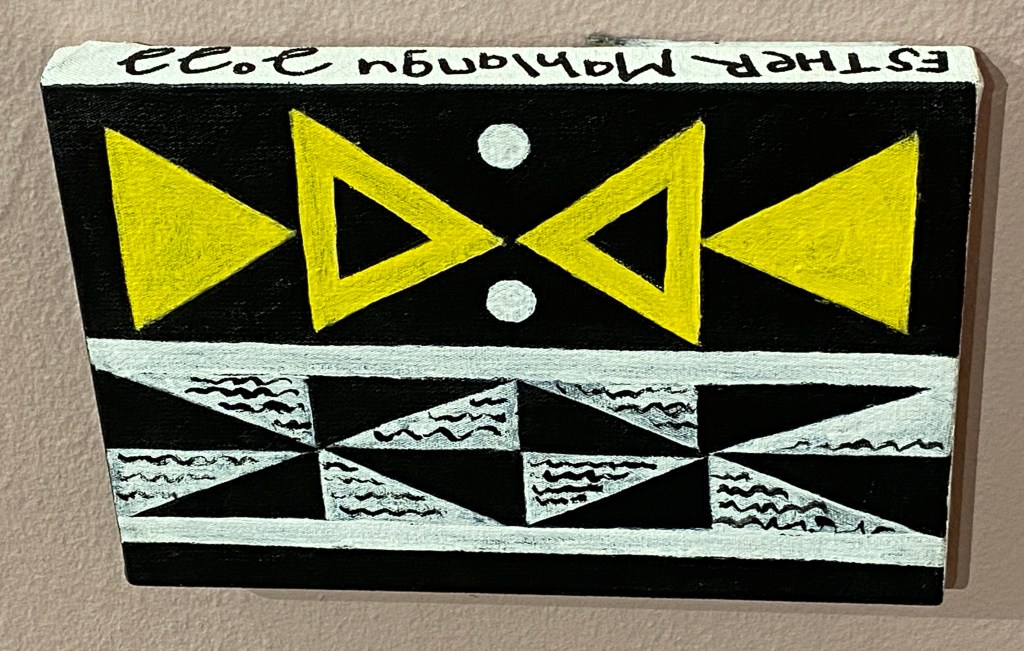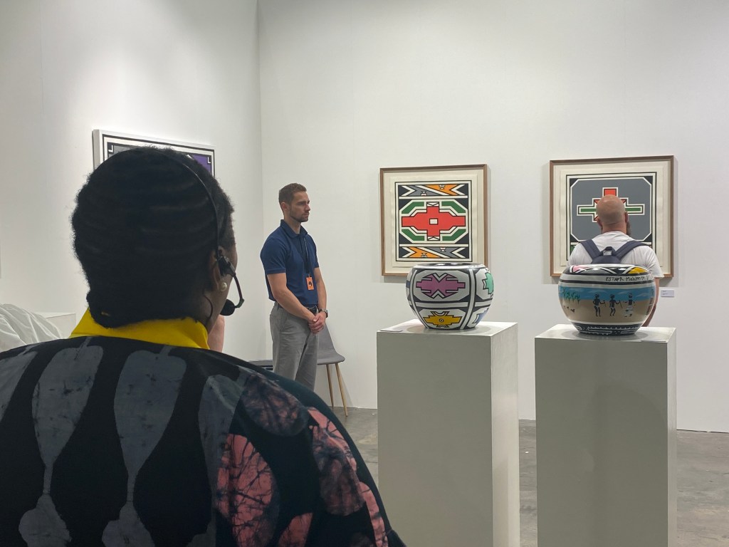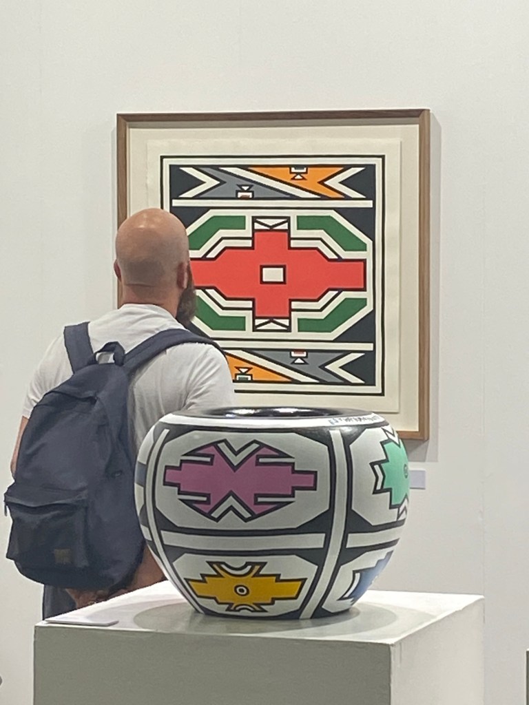 At Investec, my first up close view of an Esther Mahlangu artwork was a fiberglass pot painted in her studio, albeit signed by her.