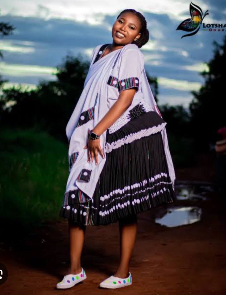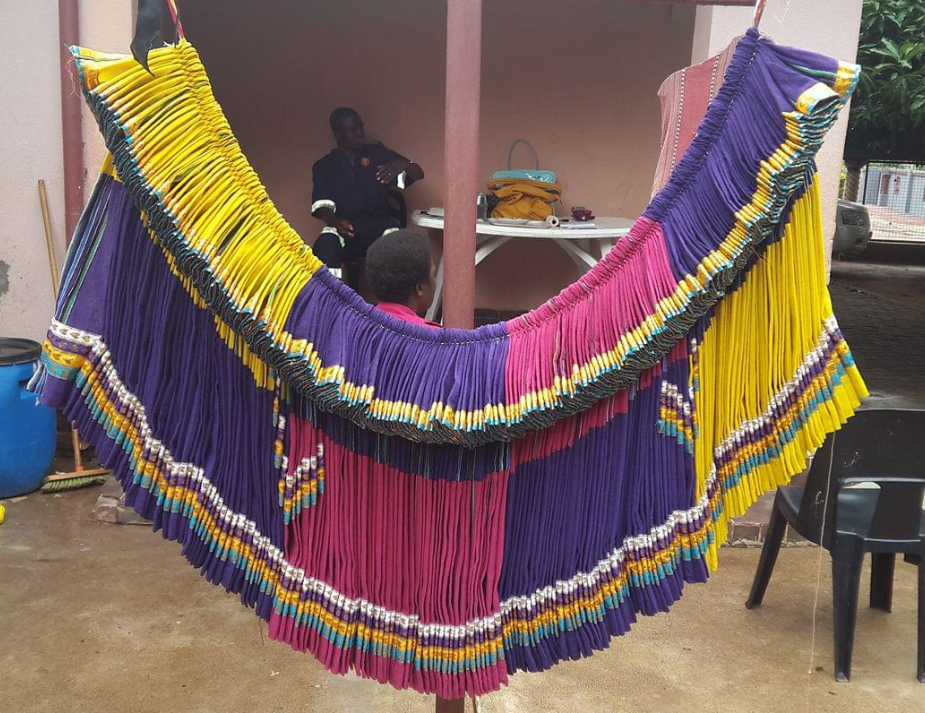 Xibelani fabric is a lightweight and flowy material that is made from polyester or cotton. It is typically printed with bold and bright geometric patterns that are inspired by traditional Tsonga designs. The fabric is made into a circular skirt that is worn with a matching top and headscarf. The skirt is gathered at the waist and has several layers of fabric that create a voluminous and dynamic effect when the wearer dances or moves.