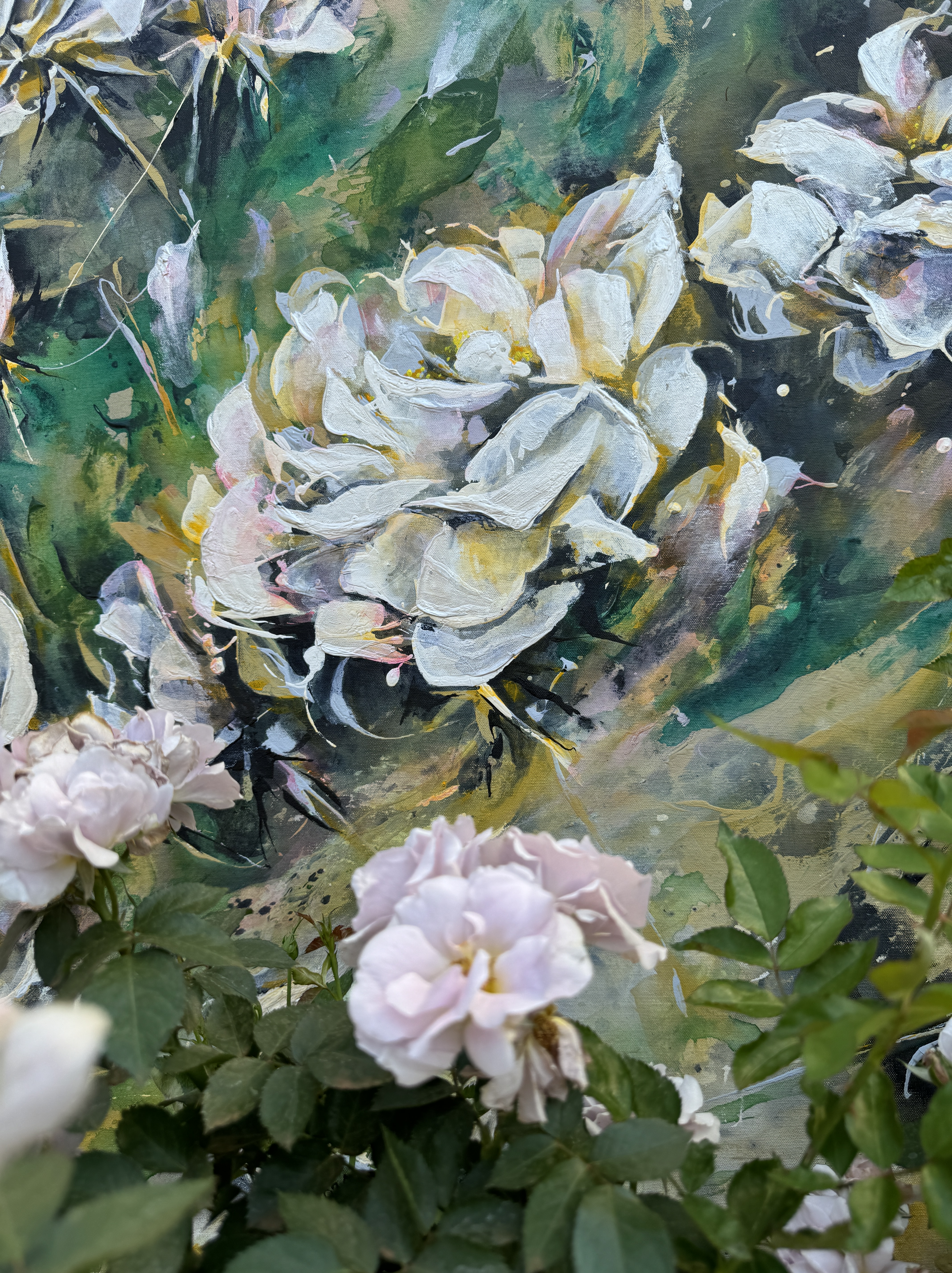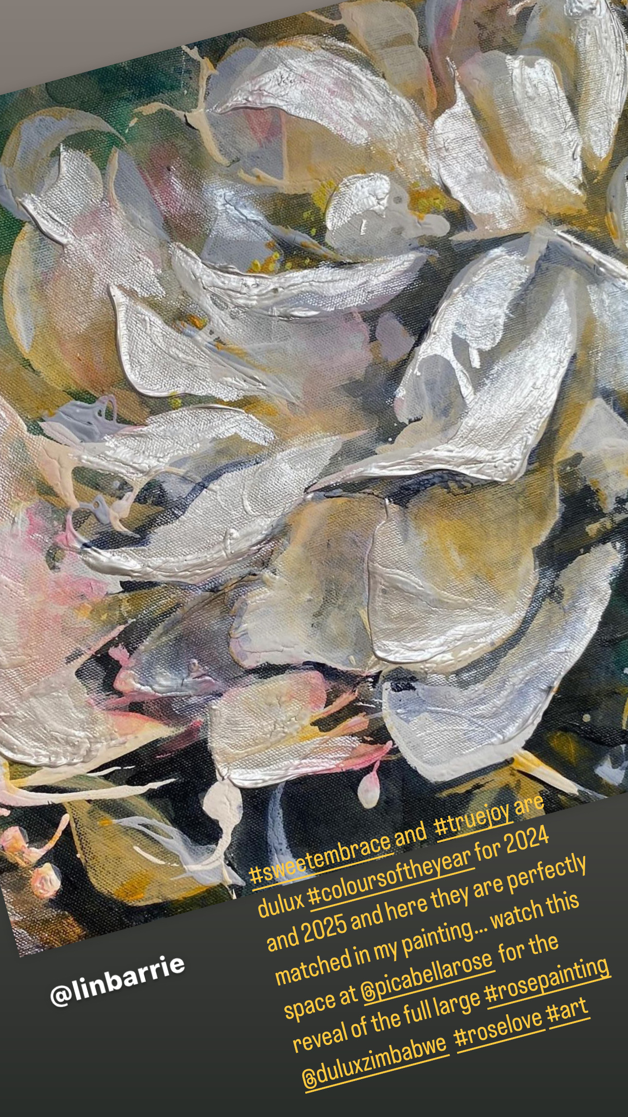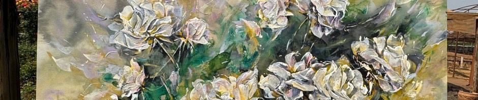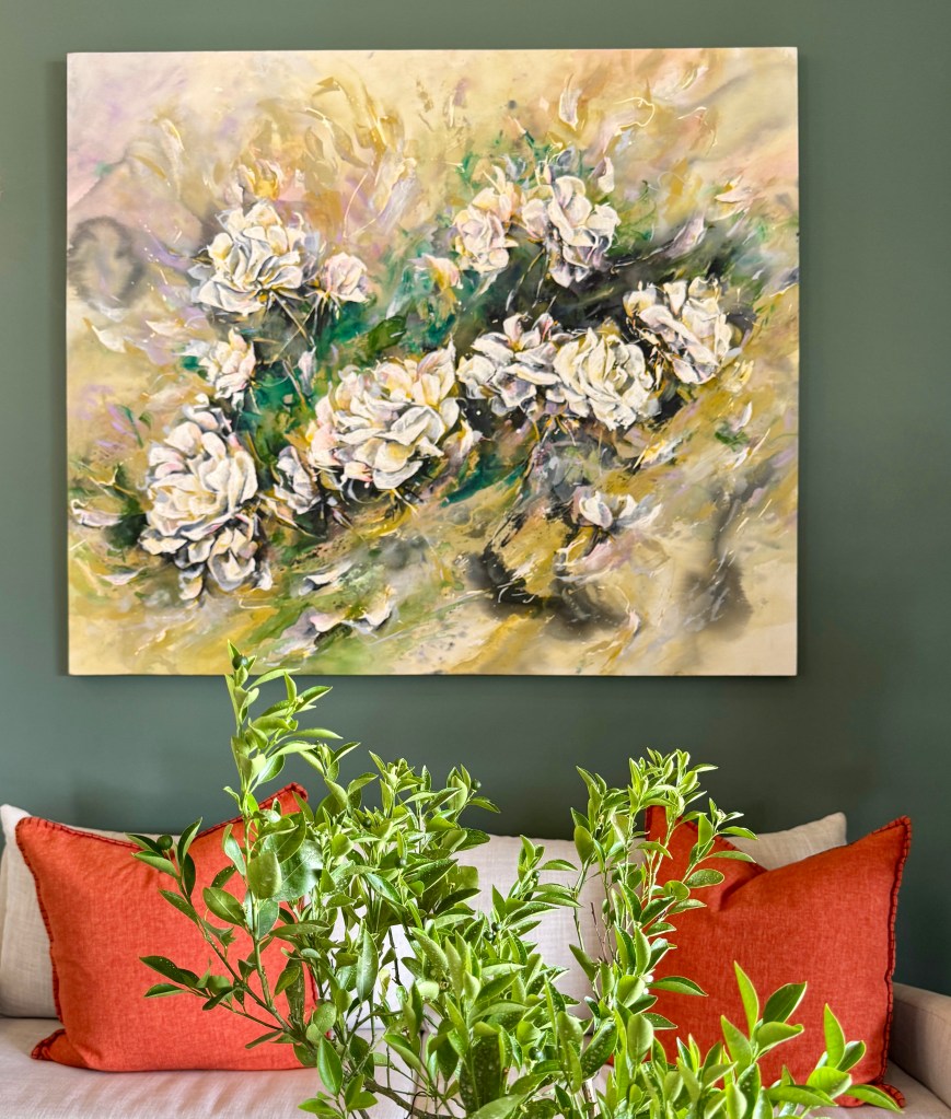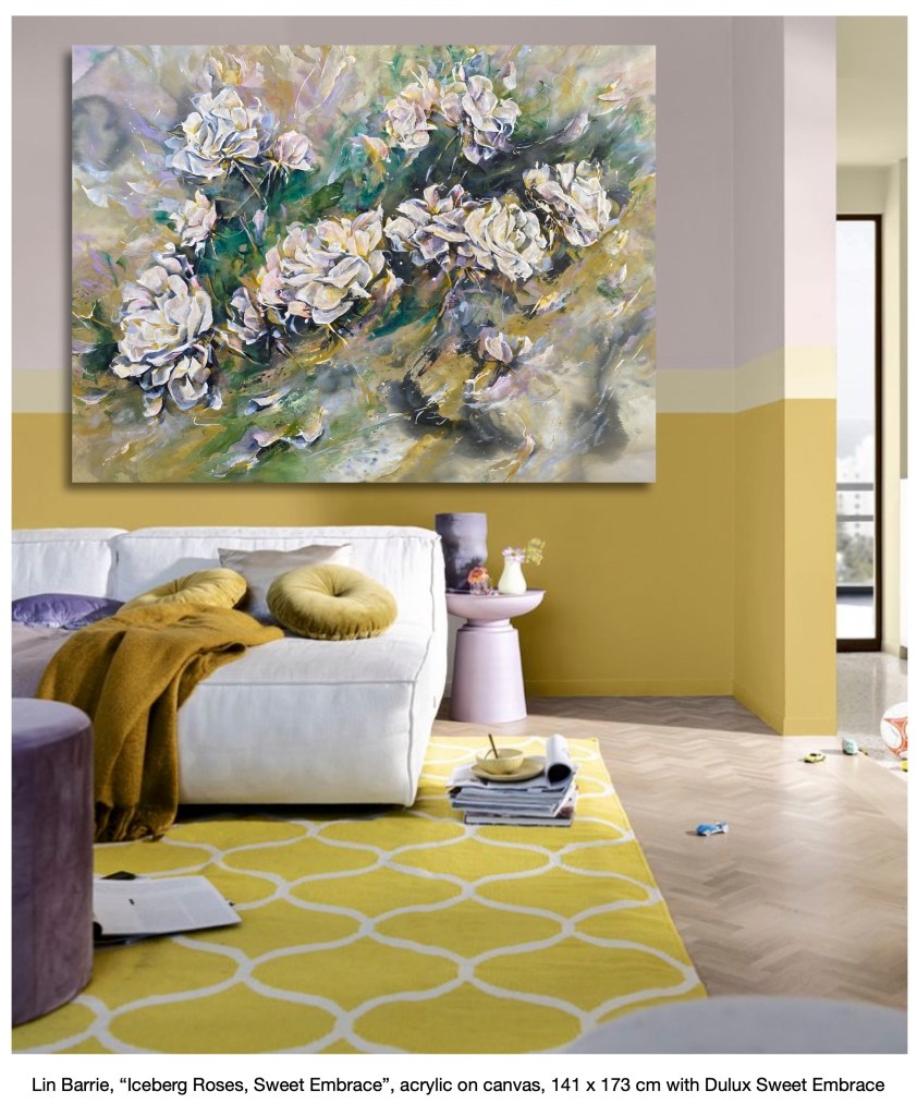 “Iceberg Roses, Sweet Embrace” is an impressionist painting I created with simple joy – and glowing with Dulux colours Sweet Embrace and True Joy….