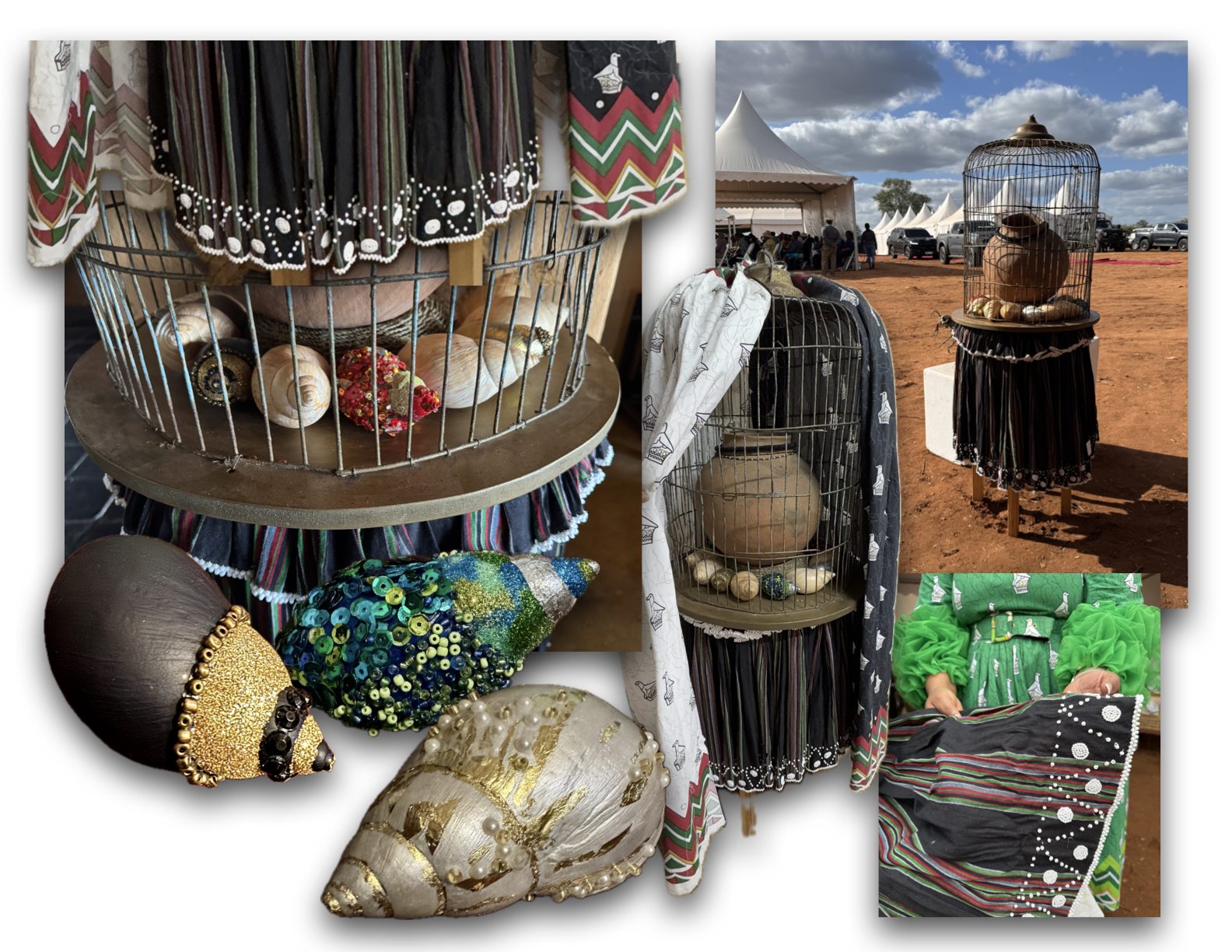At National Culture Month, one of my art displays was “Caged Culture” Art Assemblage, a ‘dancing’ lady composed of wire cage body, clay pot heart, beaded necklaces, snail shell totems, traditionalsalampore fabric beaded dancing skirt (chibabela), maceka (wraps) of Zimbabwean national fabric and wooden table legs. (Credits: I am using a skirt by Junia Matsuve, and beaded snail shells Kelli Barker)….