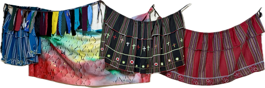 I create my “art from trash” rag strip dance skirts using recycled fabric off cuts from my dear stepdaughter who owns a business making sports-kit and school wear. These are stitched into my fashion/art ideas by Luckson, a dress maker friend in Harare… art assemblages in their own right!