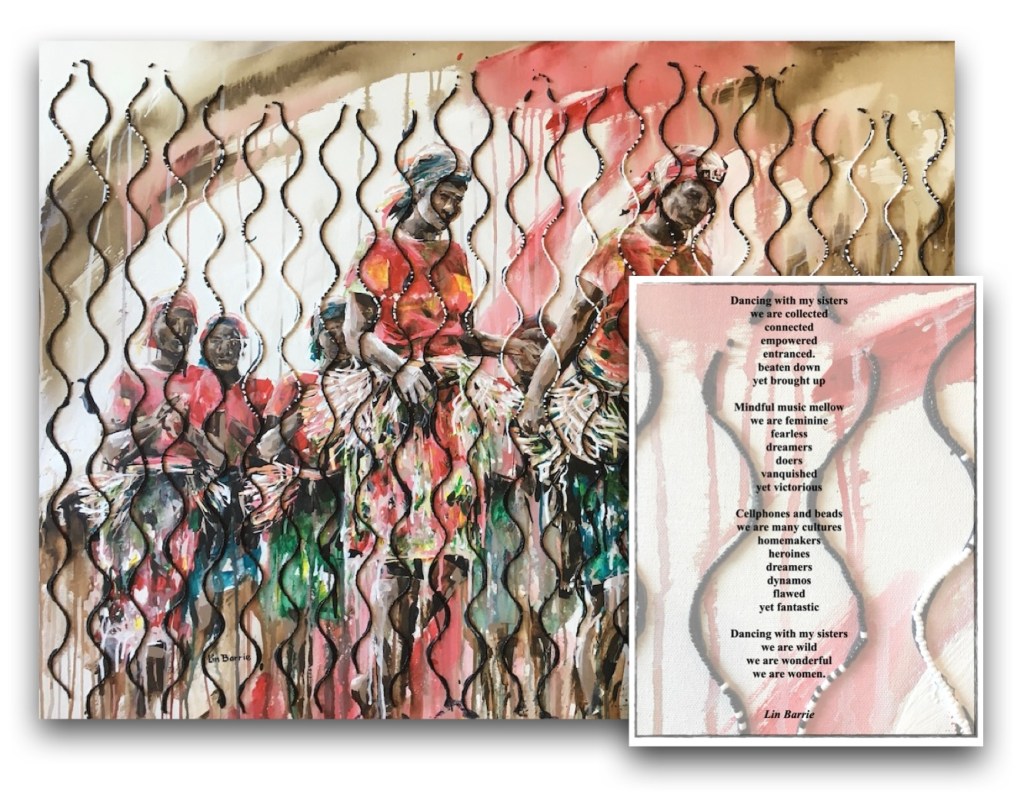 Living as I do with the Mahenye Xangana (Hlengwe) community of the south east lowveld, Dance (Kudzana/Kutamba), Storytelling (Ngano) and Poetry has long featured in my art, such as this painting and poem “Dancing with my sisters, Dancing with my cellphone…” 2018, acrylic and hand-stitched rhythmic beadwork on stretched canvas, 3 x 4 feet, and inserted is my poem…. (originally shown at The National Gallery of Zimbabwe, ‘Blood Relatives” group exhibition, 2018)