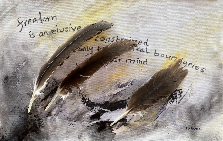 freedom-is-an-elusive-state…collage-feathers-and-acrylic-and-oil-pastel-lo-res