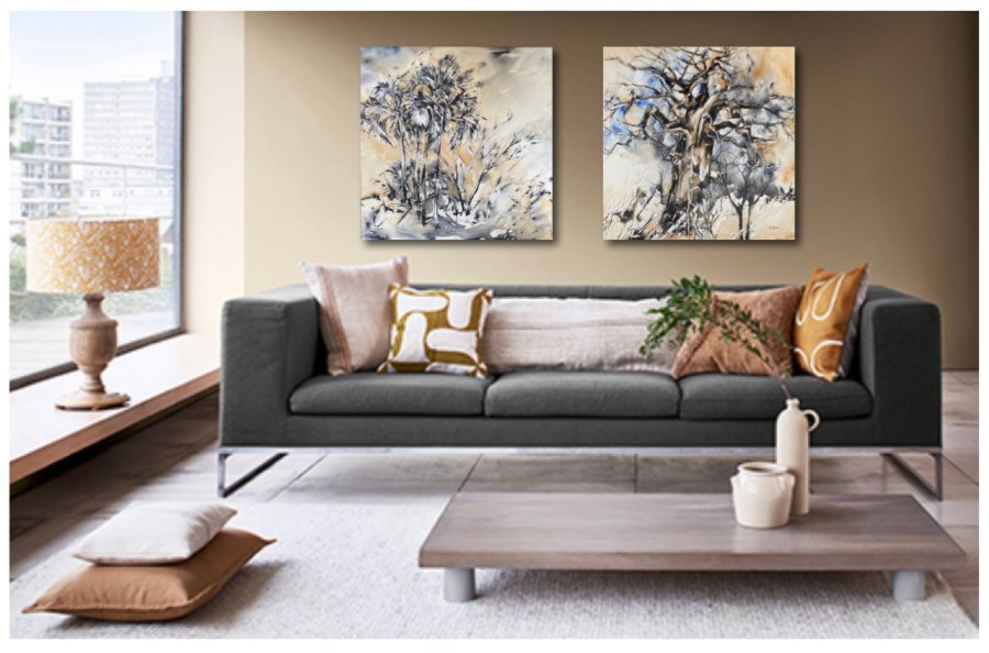 Lala Palms, acrylic:charcoal on stretched canvas, 91 x 91 cm and Baobab Chishakwe, mixed media on stretched canvas, (acrylic and charcoal), 90 x 90 cm, with Dulux ‘Brave Ground’ wall paint .1