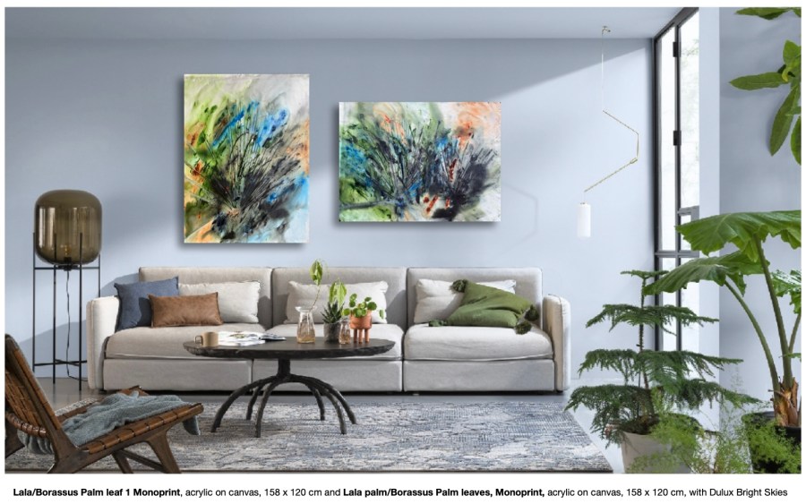 Lala:Borassus Palm leaf 1 Monoprint, acrylic on canvas, 158 x 120 cm and Lala palm:Borassus Palm leaves, Monoprint, acrylic on canvas, 158 x 120 cm a with Dulux Bright Skies.1