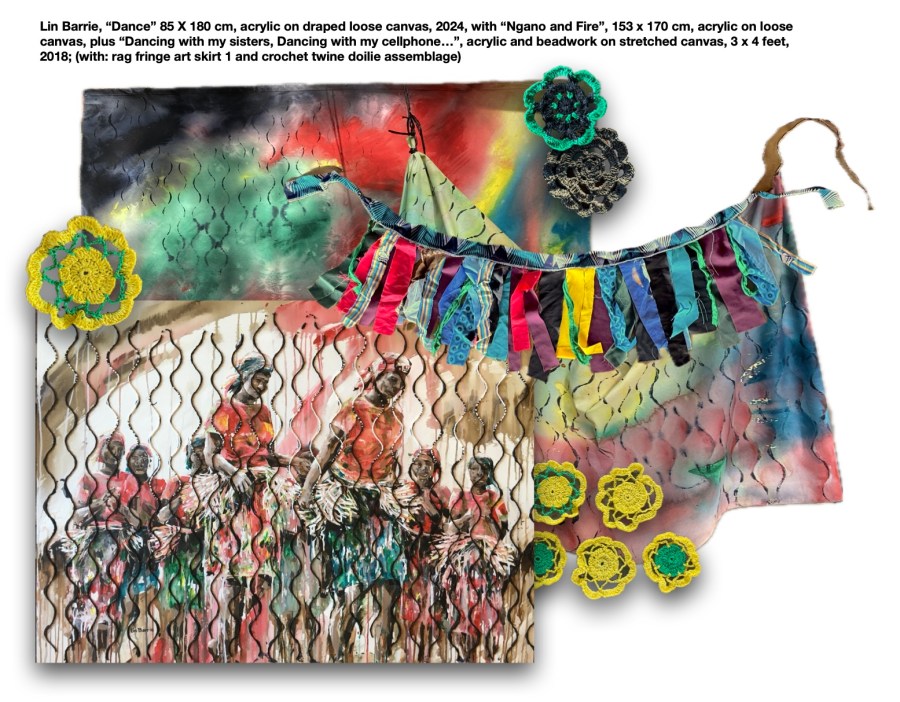 Lin Barrie, “Dance” 85 X 180 cm, acrylic on draped loose canvas, 2024, with “Ngano and Fire”, 153 x 170 cm, acrylic on loose canvas, plus “Dancing with my sisters, Dancing with my cellphone…”, acrylic and beadwork on stretched canvas, 3