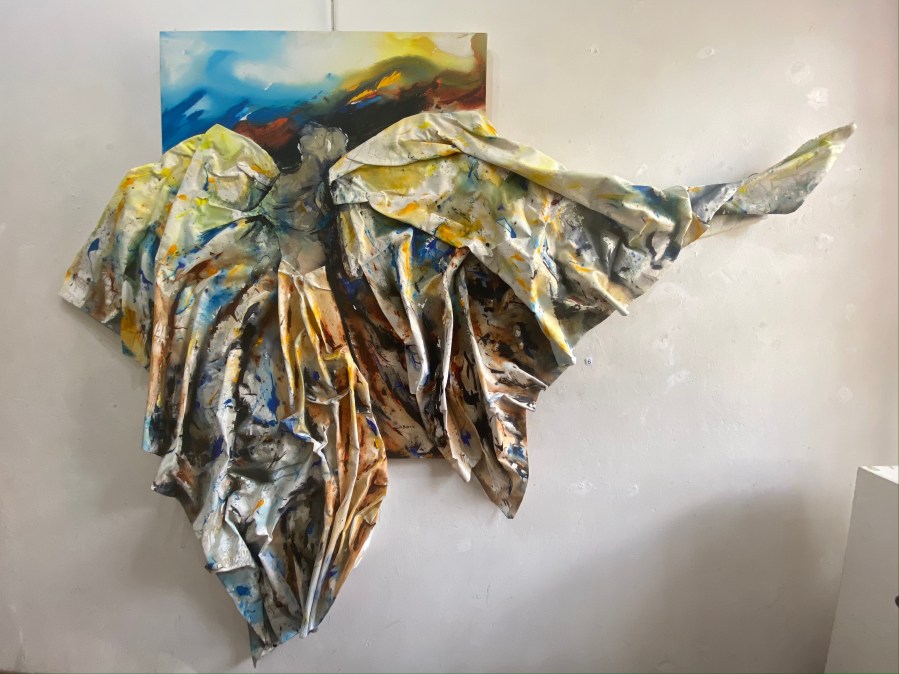 Lin Barrie, Winged Victory; Beyond Beyonce, mixed media collage on draped canvas, 3 x 4 feet plus wings
