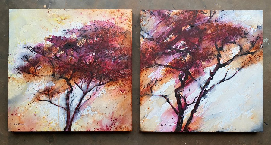 Msasa 1 and 2 diptych, acrylic on stretched canvas, each panel 2 x 2 feet,