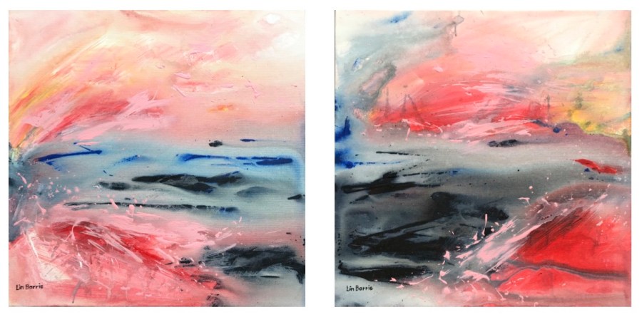 New Dawn diptych 2, and 1, acrylic on canvas, 2 x 2 feet final lo res
