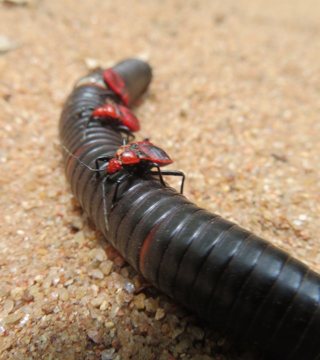to the frantic millipede desperately trying to escape the vicious attack of fierce little red beetles, minute predatory Davids overcoming the Goliath…