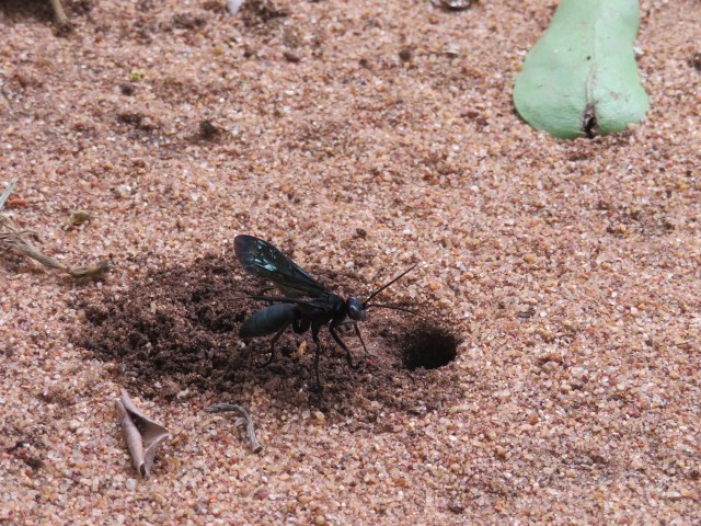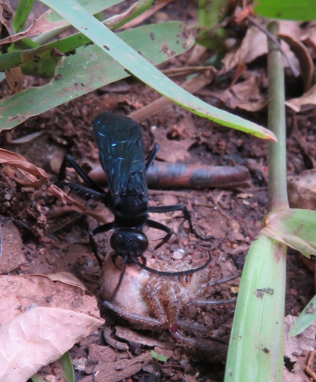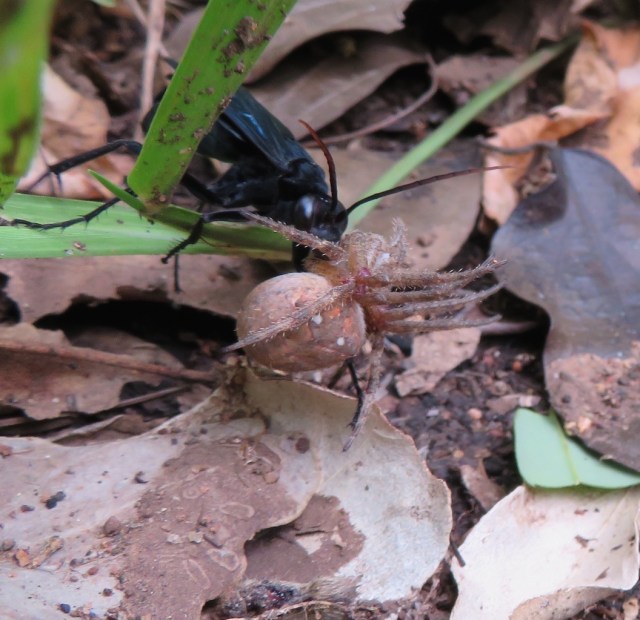 and hauls it to a hole, ready to lay eggs on the living abdomen of the spider; a ready-made and helplessly living larder to supply nutrition to a new generation of baby wasps once they hatch!