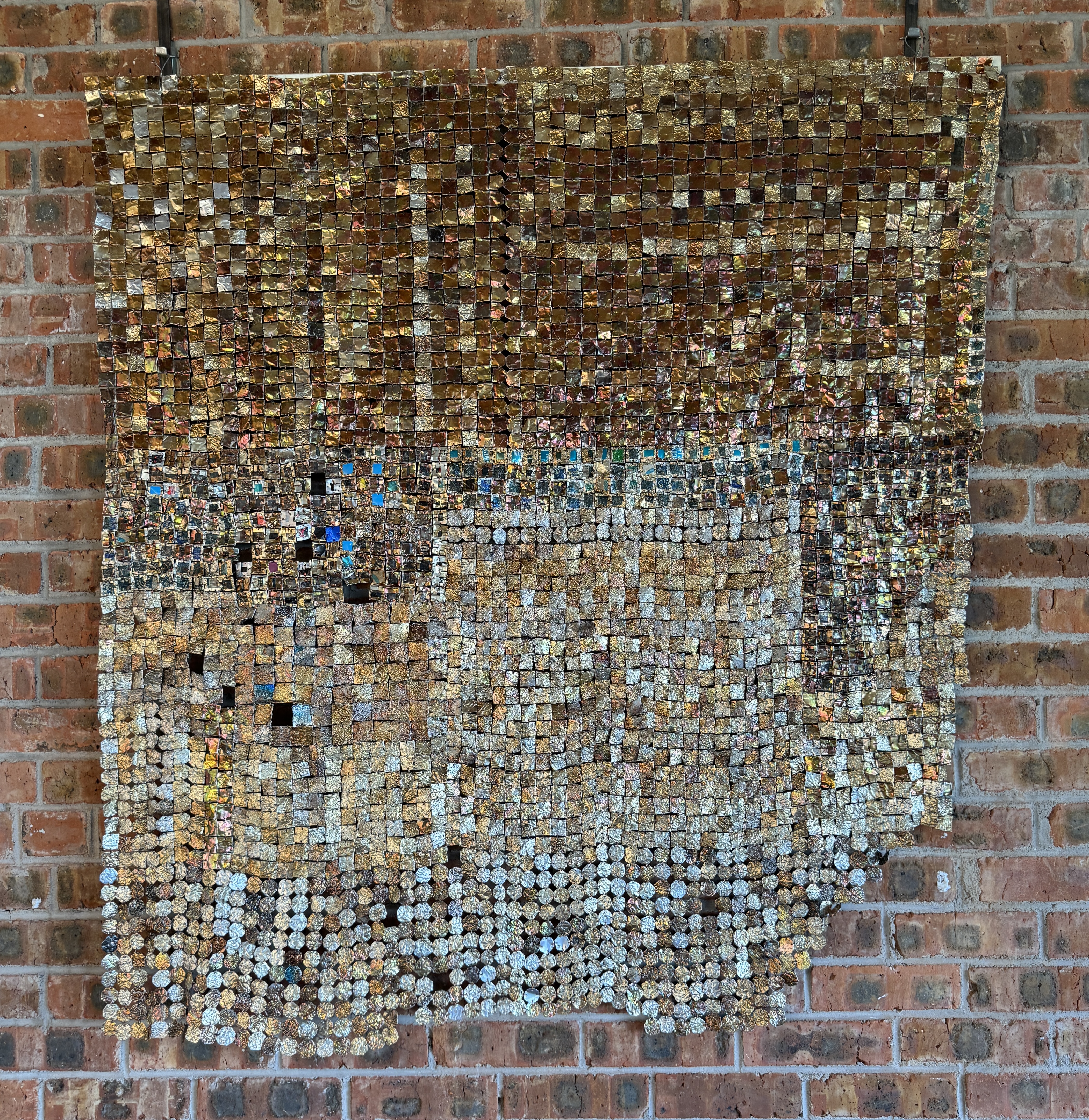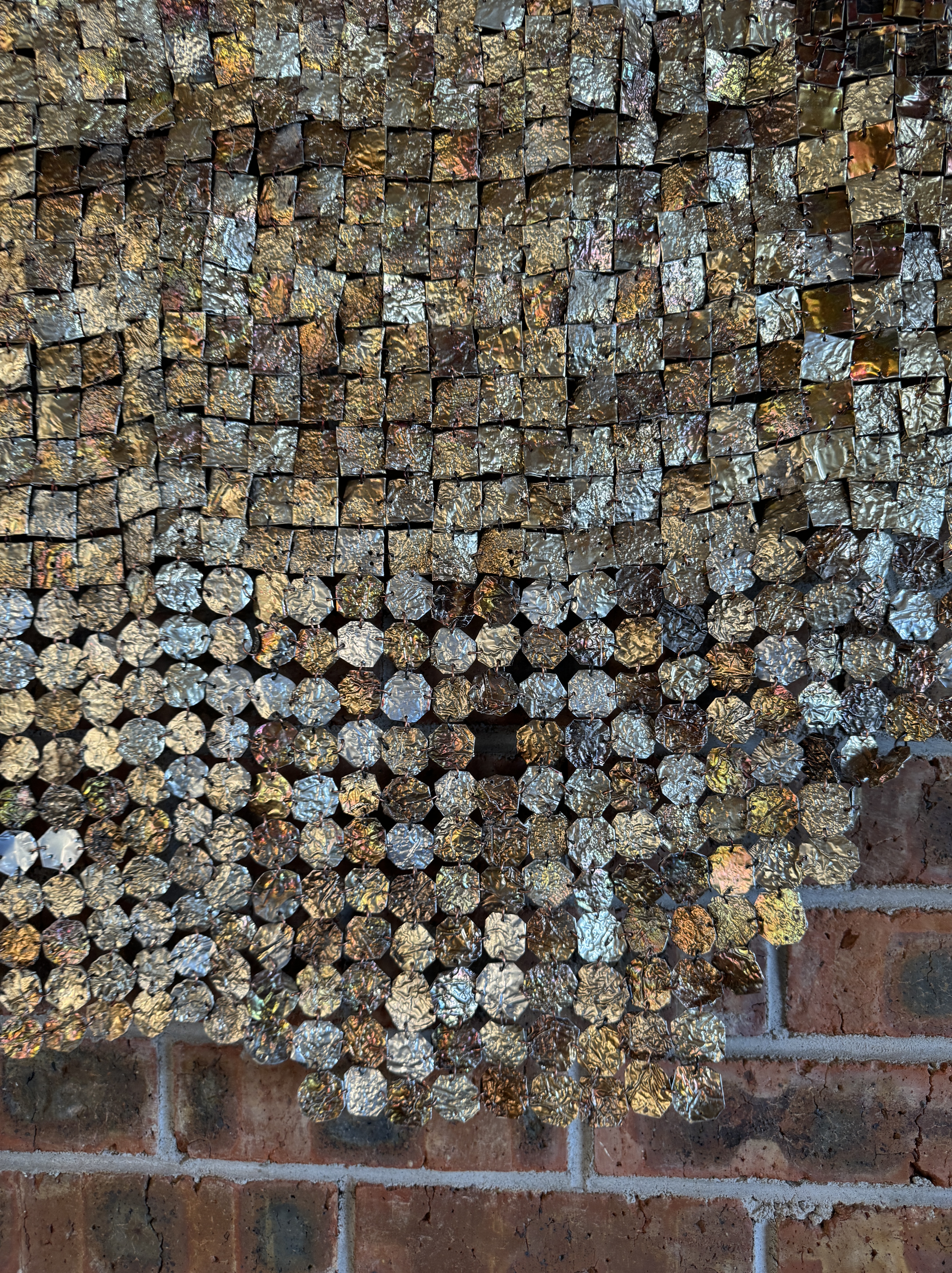 Oh!!! Eat your heart out El Anatsui !!! …At the entrance to the living area of Miombo Lodge, Zibusiso Tshumai from Bulawayo displays a shimmering sheet of treasured delight- here is the full piece against a red brick wall …