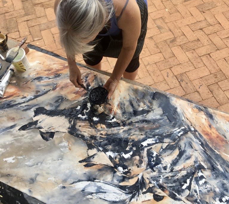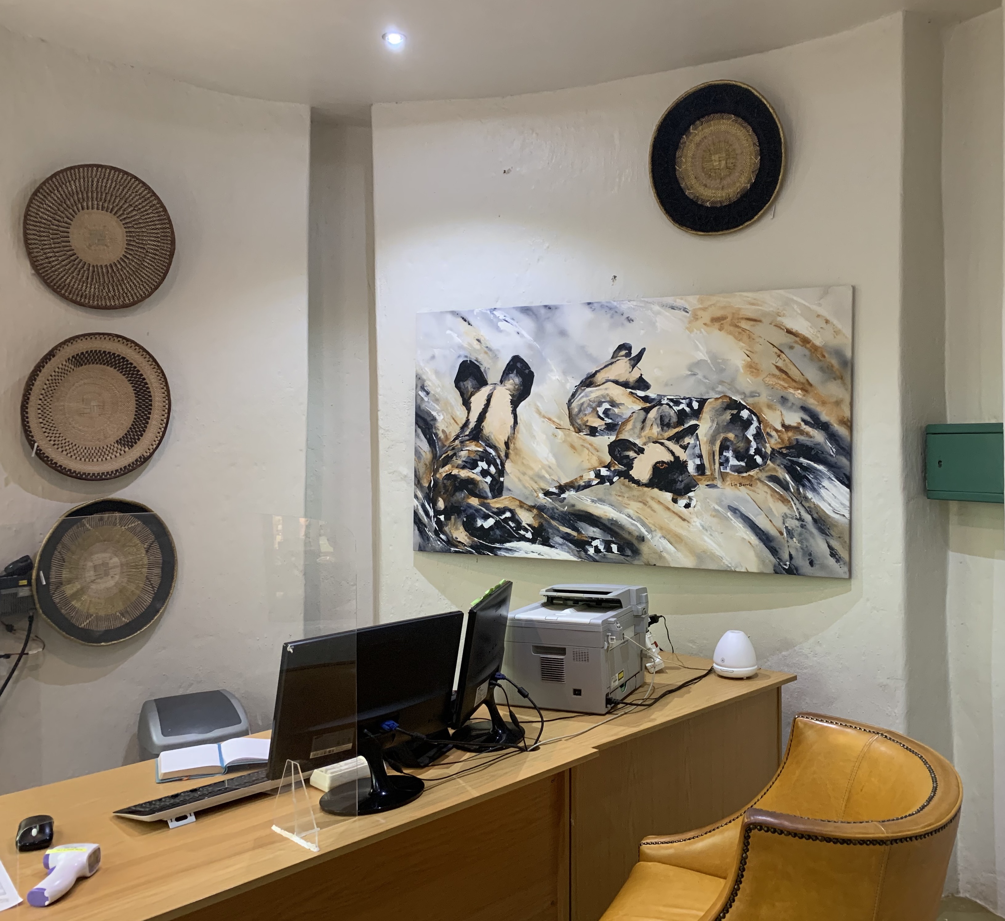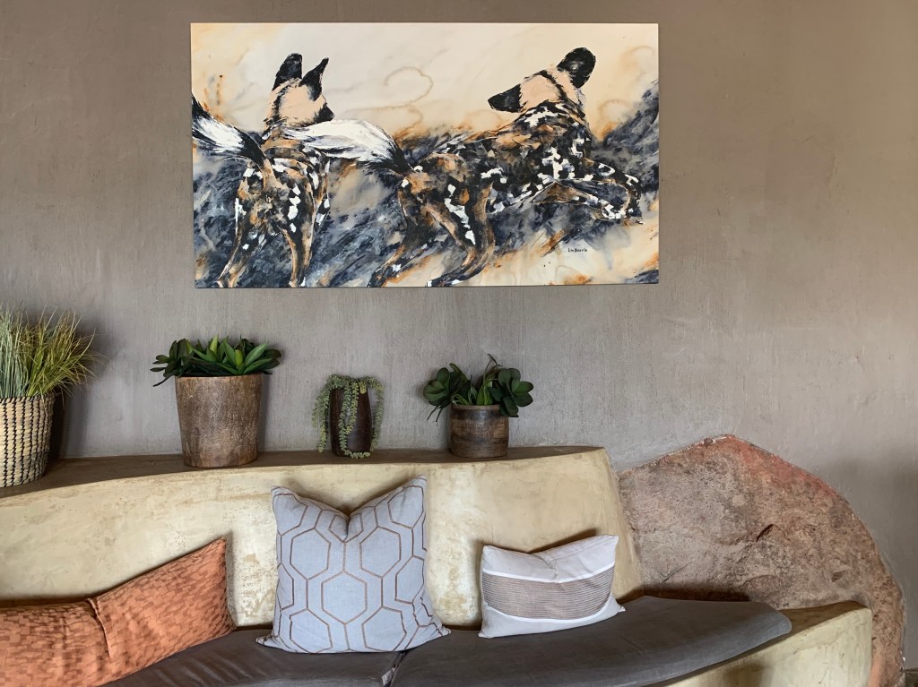 even the office at Madikwe gets interior pizzaz with a painting on the wall…Resting II, acrylic on loose canvas, 106 x 180 cm in the Madikwe safari Lodge Office ….