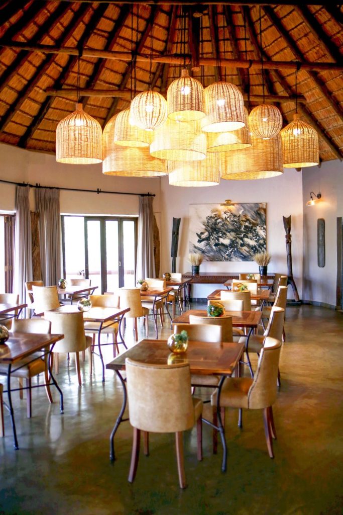 set against the layered, textured local stonework of a Madikwe fireplace….