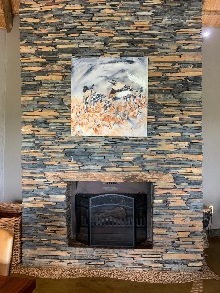 This large oil painting of mine is a permanent fixture on the wall of the dining room, a cultured space where comfort meets safari chic and delicious food is served to travelers from all over the world………