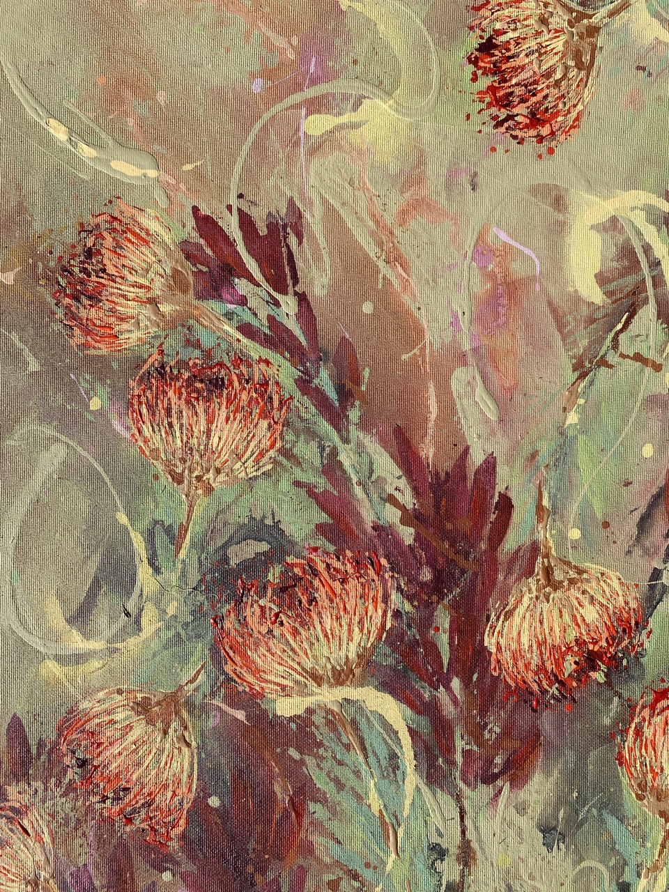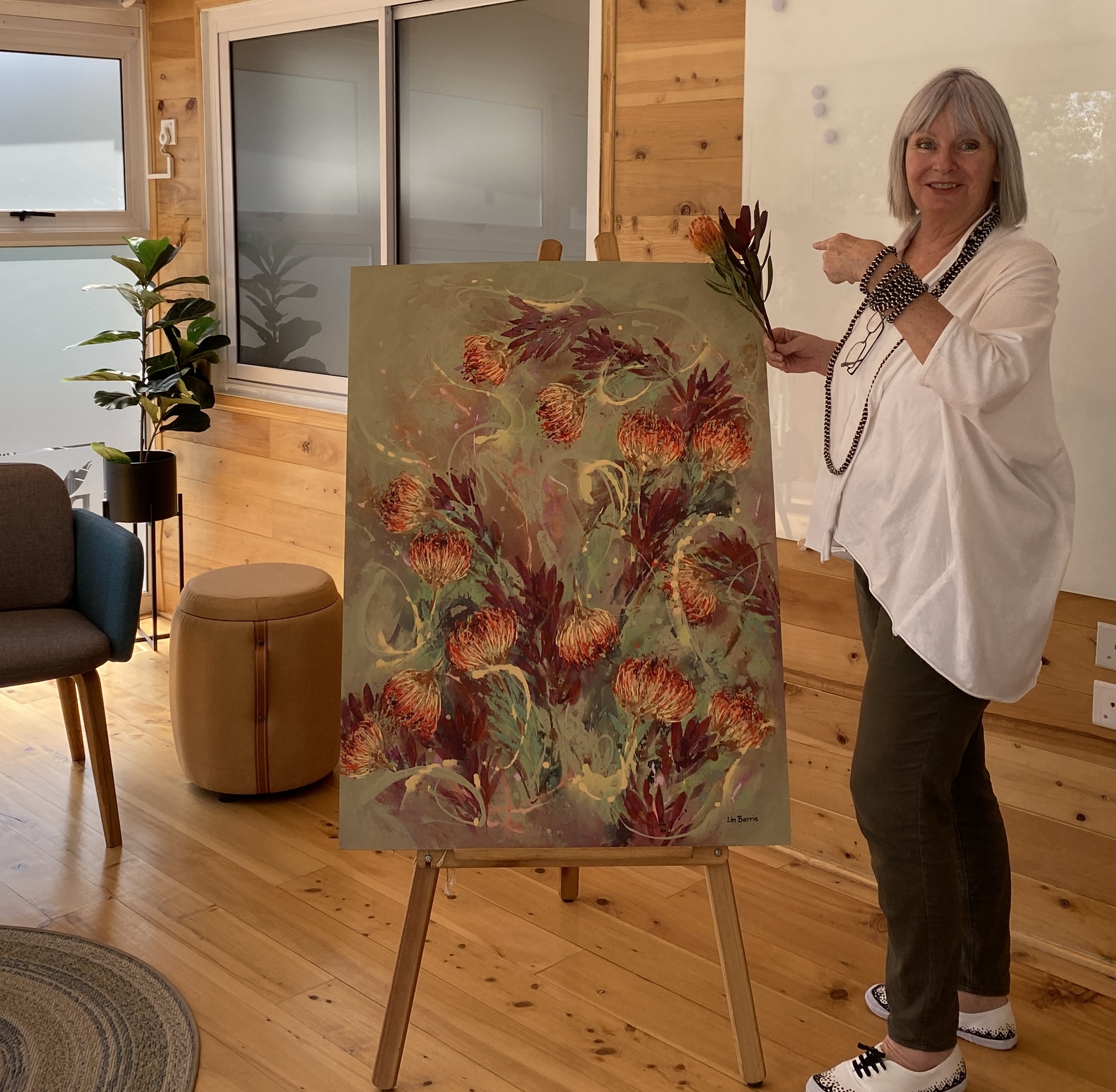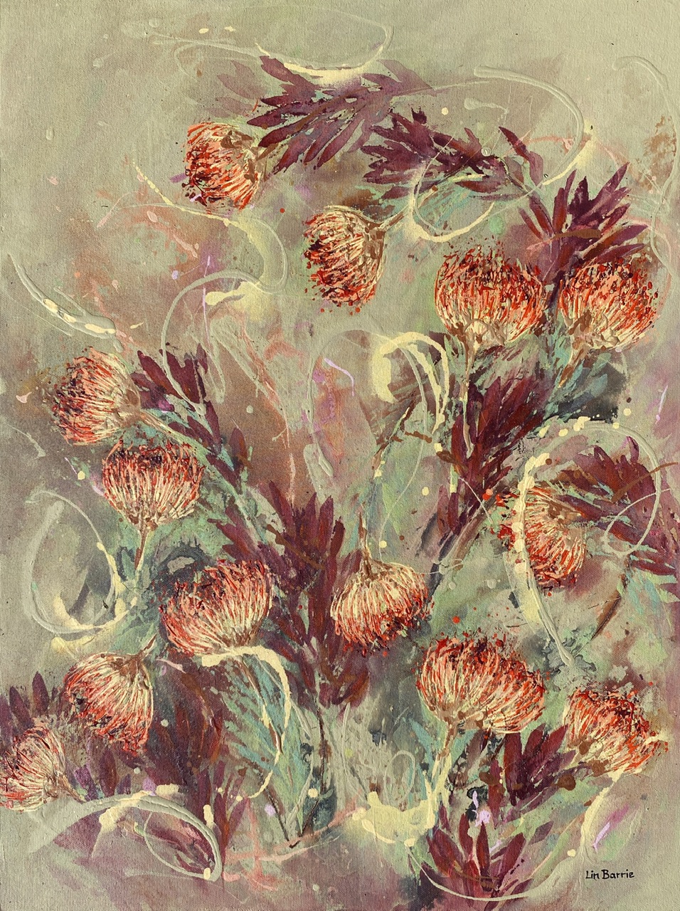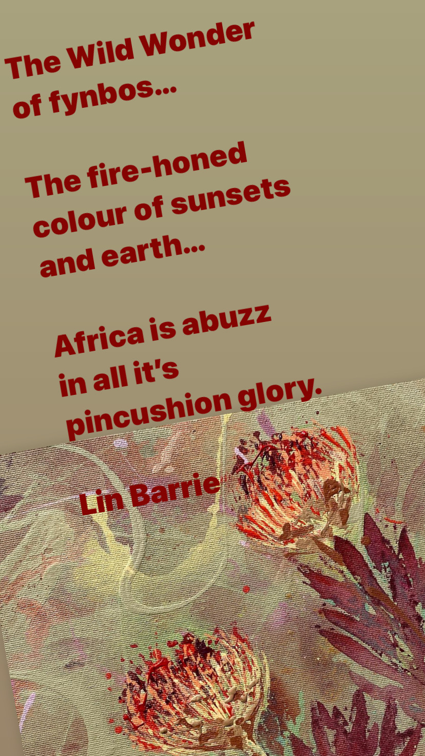 My large painting called Wild Wonder Pincushion is ablaze with the peachy oranges and flashes of fiery red that stud the veld when these leucospermums are in bloom.